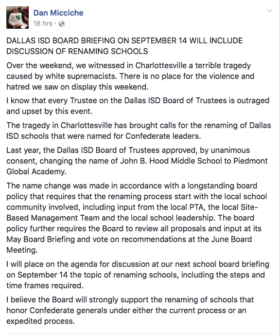 Dan Micciche, president of the board, called Charlottesville “a terrible tragedy” and believes “the Board will strongly support the renaming of schools that honor Confederate generals under either the current process or an expedited process.”