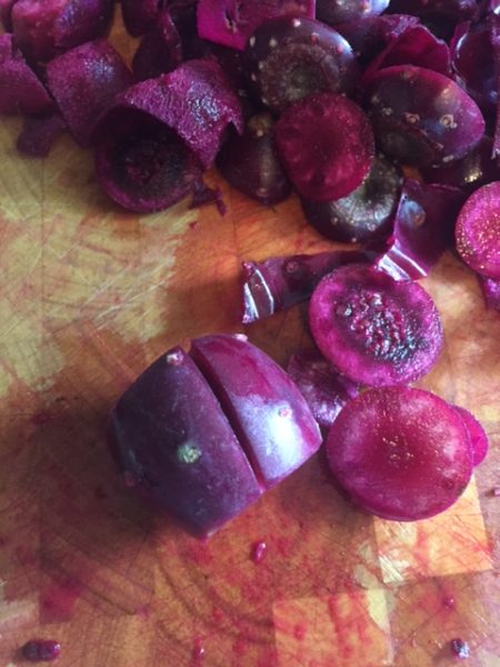 It would be smart to use tongs to pull the tunas off the prickly pear. But I don’t own tongs, so I just used ski gloves (because I also don’t own work gloves). It worked fine, but I did get a few stickers under my skin, and I’m still not sure how I’m going to get all of those fine little stickers out of my ski gloves. There are brighter ideas.