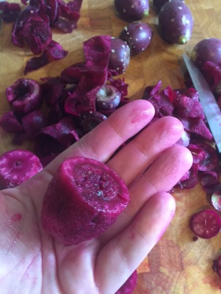 Prickly pear fruit is similar in consistency to kiwi, but they have big hard seeds, so it takes a bit of processing to make the nectar.