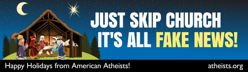“Everyone knows that the stories we’re told in church aren’t the truth,” said American Atheist president David Silverman. “Spend time with your friends and family, give gifts, do charitable work, and enjoy the season. You can do all of that while also celebrating the truth.”
