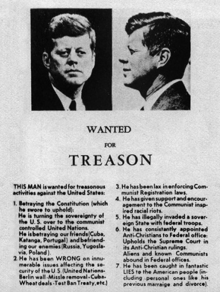 The morning of John F. Kennedy’s visit to Dallas, Lawrence found on his family’s front doorstep a flyer that looked just like a WANTED poster. It was Kennedy; the text said he was “Wanted for Treason.” Below that his crimes were listed, seven items such as: betraying the Constitution, giving support to communist-inspired racial riots, appointing anti-Christians to federal office, and lying to the American people about his previous marriage and divorce.