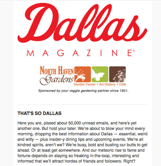 Here you are, pissed about 50,000 unread emails, and here’s yet another one. But hold your tater. We’re about to blow your mind every morning, dropping the best information about Dallas — essential, weird and witty — plus insider-y dining tips and upcoming events. We’re all kindred spirits, aren’t we? We’re busy, bold and busting our butts to get ahead. Or at least get somewhere. And our meteoric rise to fame and fortune depends on staying so freaking in-the-loop, interesting and informed that we’ll attract hordes of friends and followers. Right?