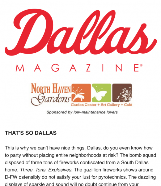 | This is why we can’t have nice things. Dallas, do you even know how to party without placing entire neighborhoods at risk? The bomb squad disposed of three tons of fireworks confiscated from a South Dallas home. Three. Tons. Explosives. The gazillion fireworks shows around D-FW ostensibly do not satisfy your lust for pyrotechnics. The dazzling displays of sparkle and sound will no doubt continue from your driveways and yards, as they do every year and throughout the week. (Oak Cliff Advocate) |