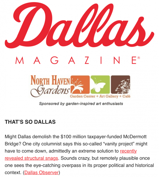 | Might Dallas demolish the $100 million taxpayer-funded McDermott Bridge? One city columnist says this so-called “vanity project” might have to come down, admittedly an extreme solution to recently revealed structural snags. Sounds crazy, but remotely plausible once one sees the eye-catching overpass in its proper political and historical context. (Dallas Observer) |